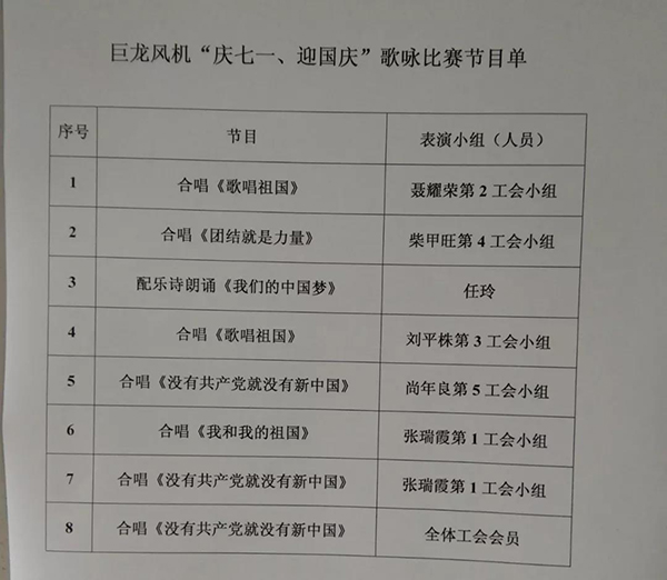 巨龍風(fēng)機“慶七一、迎國慶”歌詠比賽,得到了公司領(lǐng)導(dǎo)的大力支持,公司各部門在百忙中組織人員積極參加活動,為活動圓滿成功舉辦增添助力!